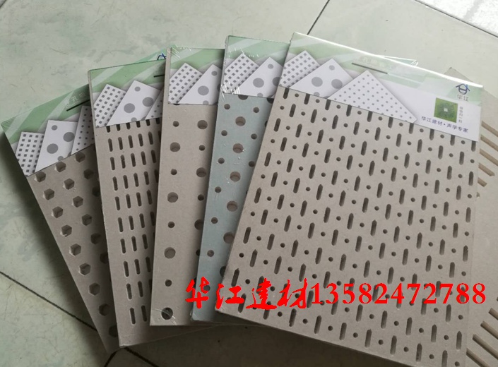 专业生产厚度8mm穿孔石膏板/8.5mm穿孔石膏板/9mm穿孔石膏板/9.5mm穿孔石膏板/10mm穿孔石膏板/12mm穿孔石膏板产品尺寸:1200*2400、1200*2700、1200*3000mm,可定做其它尺寸石膏板穿孔后,石膏板上的小孔与石膏板自身及原建筑结构的面层形成了共振腔体,声音与穿孔石膏板发生作用后,圆孔处的空气柱产生强烈的共振,空气分子与石膏板孔壁剧烈摩擦,从而大量地消耗声音能量,进行吸声。这是穿孔纸面石膏板“亥姆霍兹共振”吸声的基本原理。穿孔纸面石膏板吸声对声音频率具有一定选择性,吸声频率特性曲线呈山峰形,当声音频率与共振频率接近时,吸声系数大;当声音频率远离共振频率时,吸声系数小。如果在纸面穿孔石膏板背覆一层桑皮纸或薄吸声毡时,空气分子在共振时的摩擦阻力增大,各个频率的吸声性能都将有明显提高,这就是人们常常在穿孔纸面石膏板后覆一层桑皮纸或薄吸声毡增加吸声的原因。