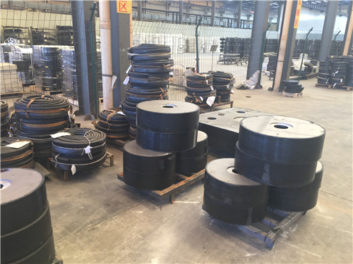KBQZ抗拉球型支座分为固定型、单向位移型和双向位移型,支座结构如图30其主要由支座顶板、不锈钢板、平面聚四氟乙烯滑板、球冠衬板、球面聚四氟乙烯滑板、中支架、聚四氟乙烯滑板、不锈钢板和滑移箱组成。支座中的相对滑移部件之间,采用目前世界上摩擦系数最低的聚四氟乙烯滑板和不锈钢板相隔,充分减小了摩擦阻力,使各部分之间的运动流畅,避免爬行现象的产生。本类支座通过球面聚四氟乙烯滑板上部构件沿着球面相对于下部构件的转动实现转角(常用值为0.02rad),在工作过程中支座沿着滑移箱滑道滑动实现水平位移。