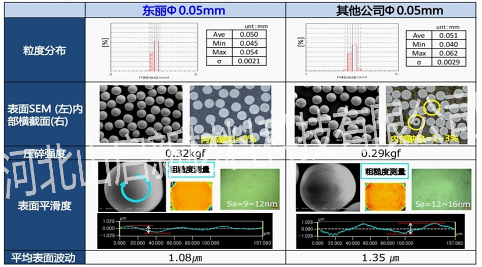 lφ0.1毫米以下的珠子在粒度分布和表面平滑度方面质量较高,平滑度是其他品牌的1.2-1.8倍,能有效提高粉碎效果