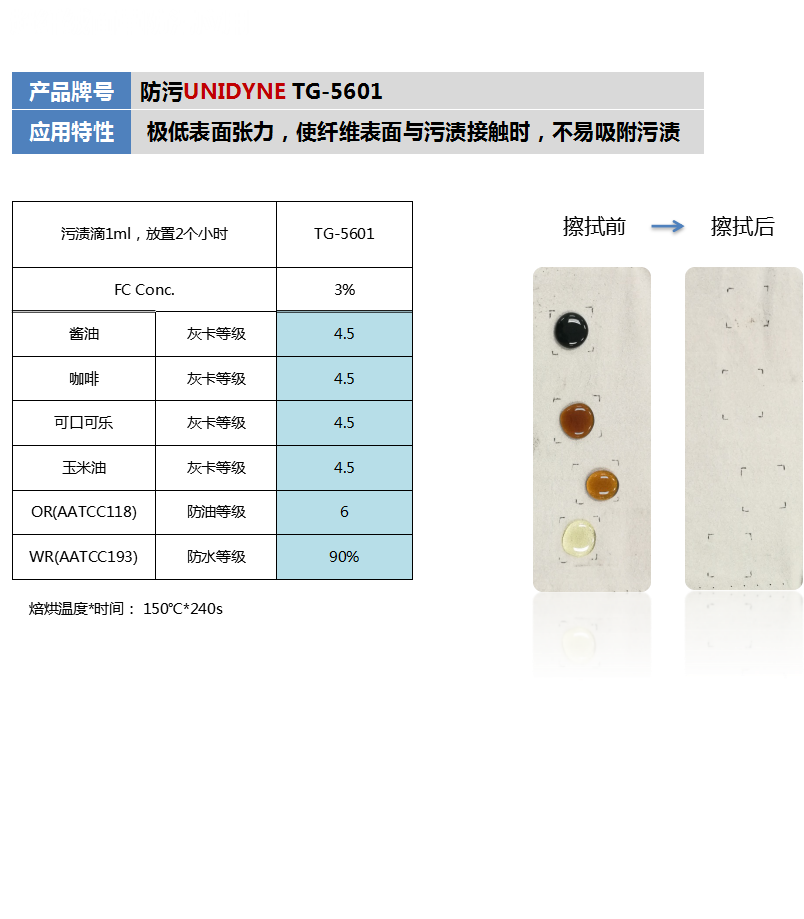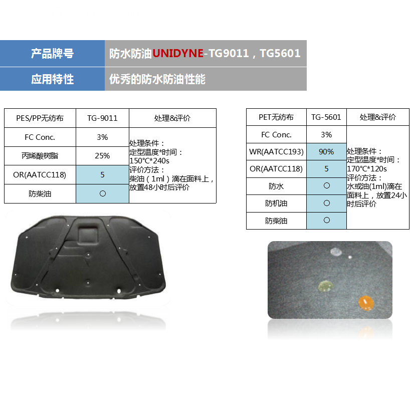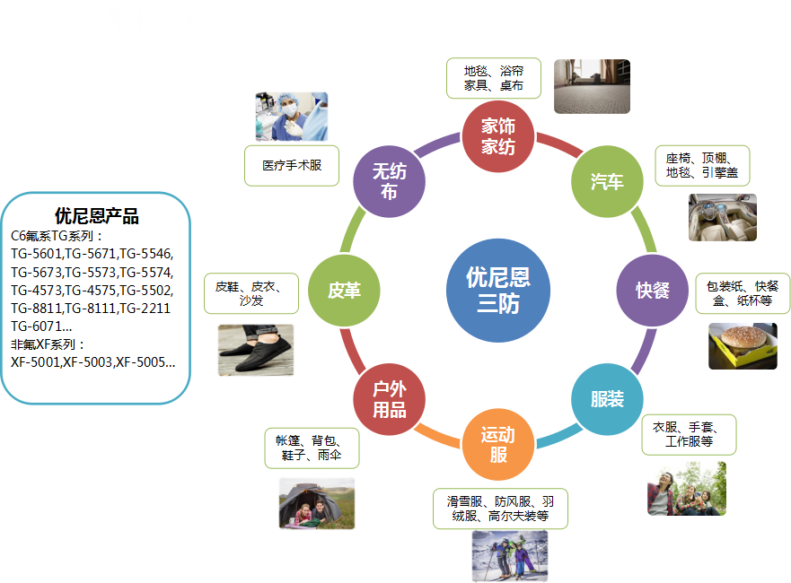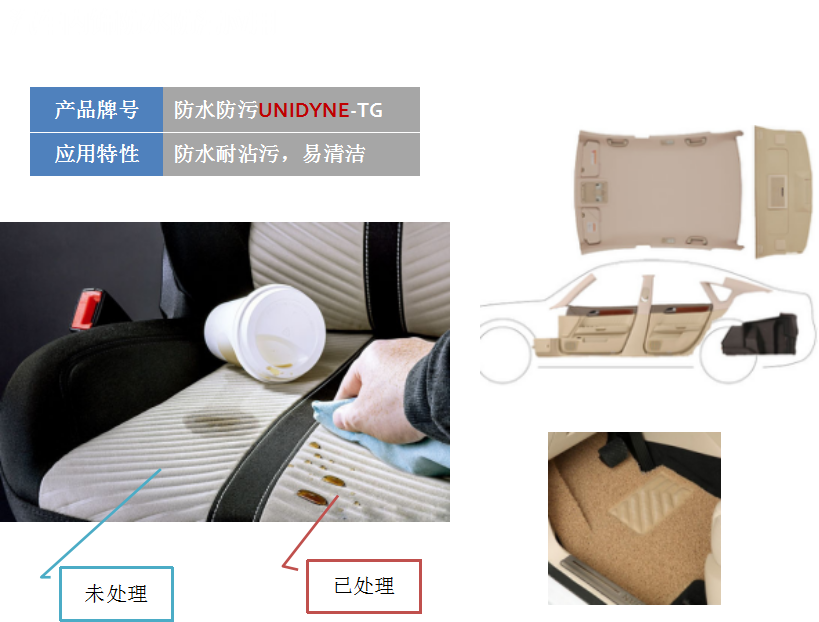 产品特点防水耐沾污,易清洁,优秀的防水防油性能赋予纺织、皮革等防水、防油、防污及易去污的功能,应用医疗手术服、座椅、顶棚、地毯、引擎盖、滑雪服、防风服、羽绒服、高尔夫装等,帐篷、背包、鞋子、雨伞,皮鞋、皮衣、沙发等。